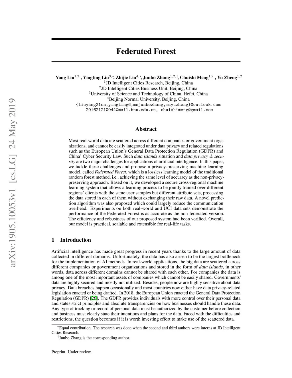 Most real-world data are scattered across different companies or government organizations, and cannot be easily integrated under data privacy and related regulations such as the European Union's General Data Protection Regulation (GDPR) and China' Cyber Security Law. Such data islands situation and data privacy & security are two major challenges for applications of artificial intelligence. In this paper, we tackle these challenges and propose a privacy-preserving machine learning model, called Federated Forest, which is a lossless learning model of the traditional random forest method, i.e., achieving the same level of accuracy as the non-privacy-preserving approach. Based on it, we developed a secure cross-regional machine learning system that allows a learning process to be jointly trained over different regions' clients with the same user samples but different attribute sets, processing the data stored in each of them without exchanging their raw data. A novel prediction algorithm was also proposed which could largely reduce the communication overhead. Experiments on both real-world and UCI data sets demonstrate the performance of the Federated Forest is as accurate as the non-federated version. The efficiency and robustness of our proposed system had been verified. Overall, our model is practical, scalable and extensible for real-life tasks.