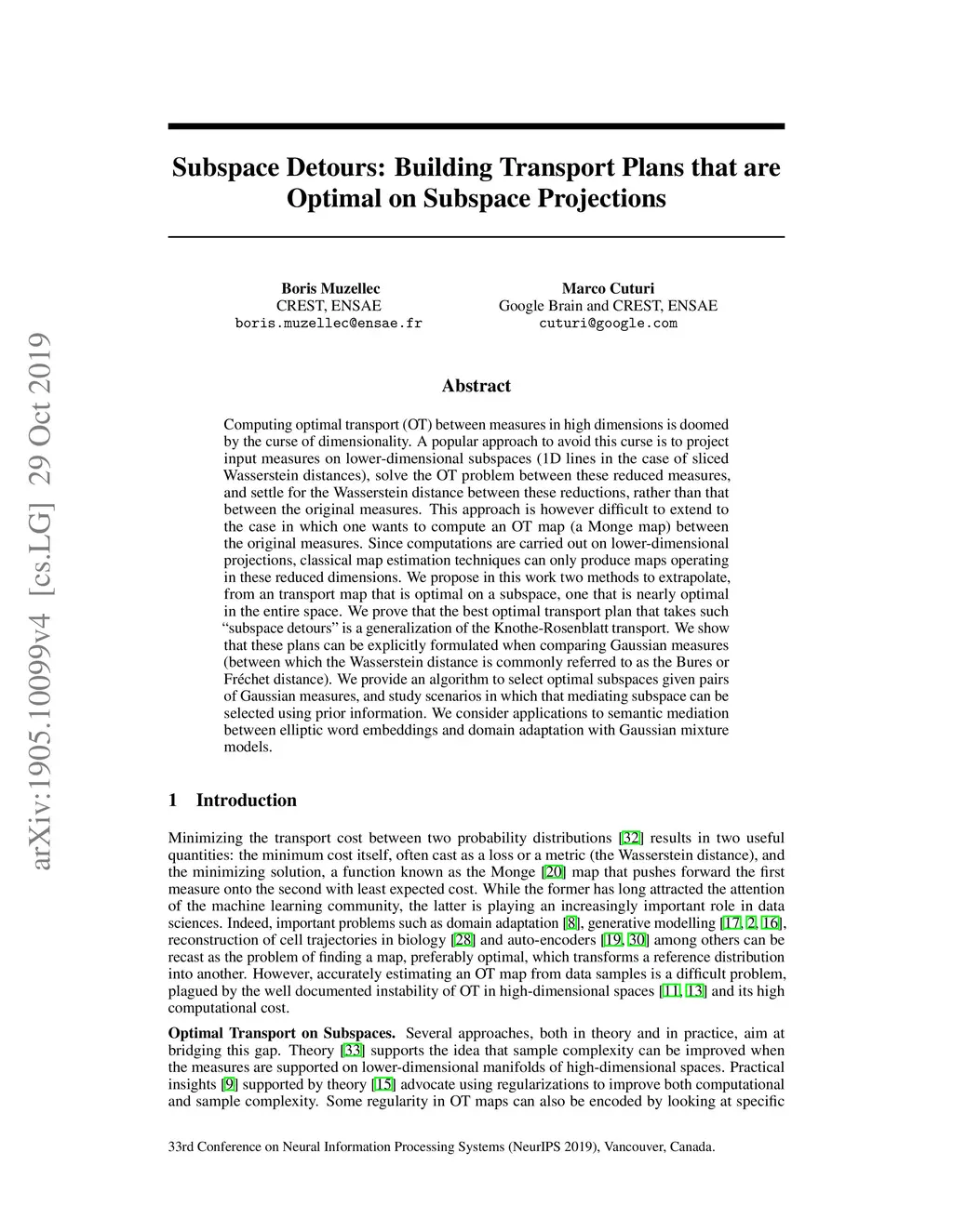 Subspace Detours: Building Transport Plans that are Optimal on Subspace