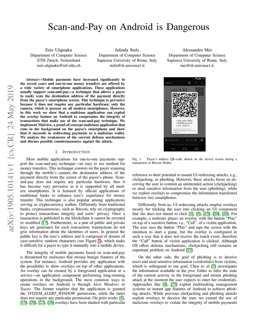 Mobile payments have increased significantly in the recent years and one-to-one money transfers are offered by a wide variety of smartphone applications. These applications usually support scan-and-pay -- a technique that allows a payer to easily scan the destination address of the payment directly from the payee's smartphone screen. This technique is pervasive because it does not require any particular hardware, only the camera, which is present on all modern smartphones. However, in this work we show that a malicious application can exploit the overlay feature on Android to compromise the integrity of transactions that make use of the scan-and-pay technique. We implement Malview, a proof-of-concept malicious application that runs in the background on the payee's smartphone and show that it succeeds in redirecting payments to a malicious wallet. We analyze the weaknesses of the current defense mechanisms and discuss possible countermeasures against the attack.