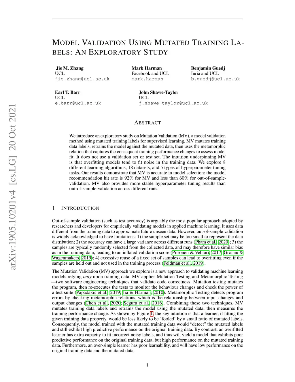 We introduce an exploratory study on Mutation Validation (MV), a model validation method using mutated training labels for supervised learning. MV mutates training data labels, retrains the model against the mutated data, then uses the metamorphic relation that captures the consequent training performance changes to assess model fit. It does not use a validation set or test set. The intuition underpinning MV is that overfitting models tend to fit noise in the training data. We explore 8 different learning algorithms, 18 datasets, and 5 types of hyperparameter tuning tasks. Our results demonstrate that MV is accurate in model selection: the model recommendation hit rate is 92\% for MV and less than 60\% for out-of-sample-validation. MV also provides more stable hyperparameter tuning results than out-of-sample-validation across different runs.
