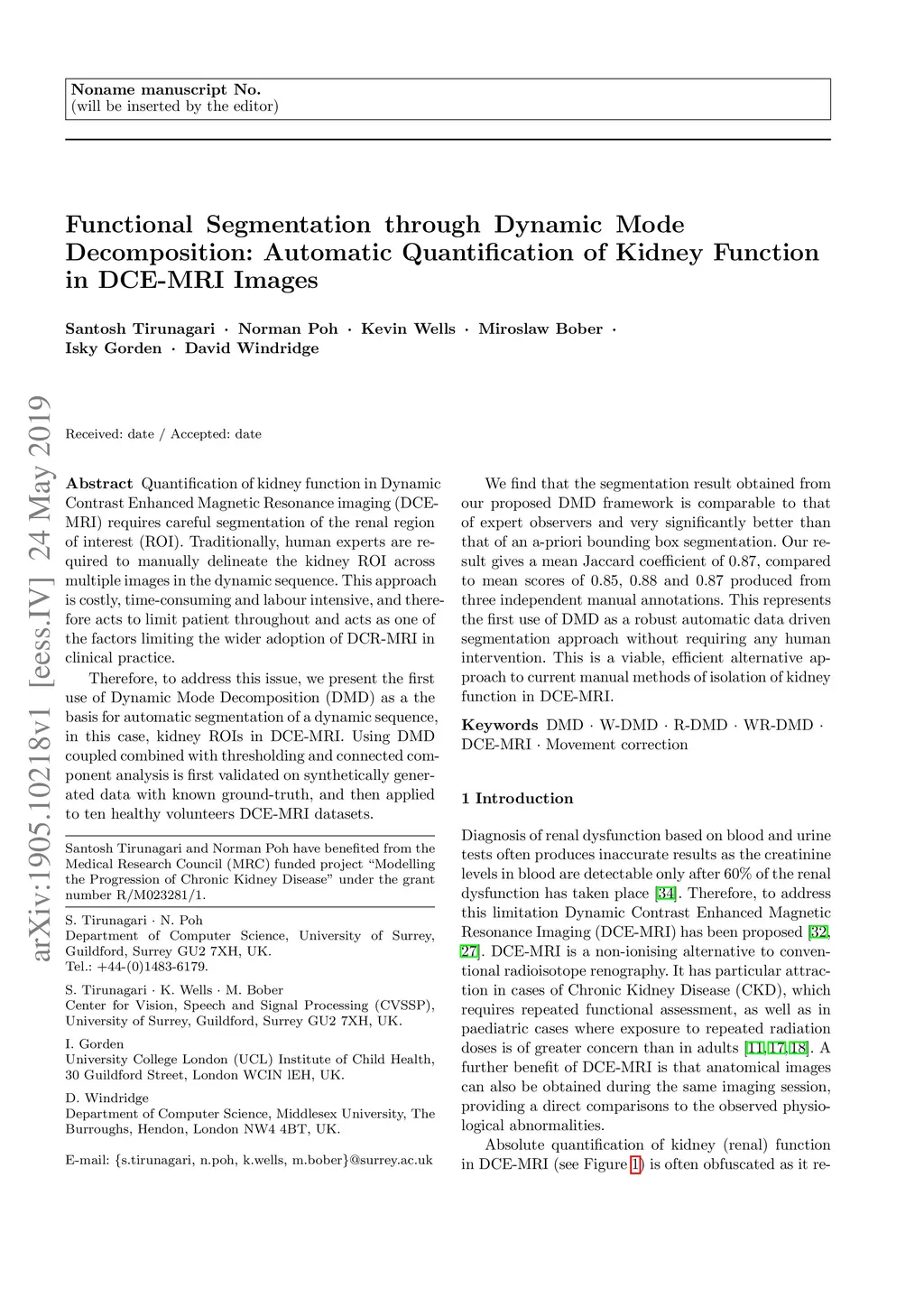 Quantification of kidney function in Dynamic Contrast-Enhanced Magnetic Resonance Imaging (DCE-MRI) requires careful segmentation of the renal region of interest (ROI). Traditionally, human experts are required to manually delineate the kidney ROI across multiple images in the dynamic sequence. This approach is costly, time-consuming and labour intensive, and therefore acts to limit patient throughout and acts as one of the factors limiting the wider adoption of DCR-MRI in clinical practice. Therefore, to address this issue, we present the first use of Dynamic Mode Decomposition (DMD) as a basis for automatic segmentation of a dynamic sequence, in this case, kidney ROIs in DCE-MRI. Using DMD coupled combined with thresholding and connected component analysis is first validated on synthetically generated data with known ground-truth, and then applied to ten healthy volunteers' DCE-MRI datasets. We find that the segmentation result obtained from our proposed DMD framework is comparable to that of expert observers and very significantly better than that of an a-priori bounding box segmentation. Our result gives a mean Jaccard coefficient of 0.87, compared to mean scores of 0.85, 0.88 and 0.87 produced from three independent manual annotations. This represents the first use of DMD as a robust automatic data-driven segmentation approach without requiring any human intervention. This is a viable, efficient alternative approach to current manual methods of isolation of kidney function in DCE-MRI.