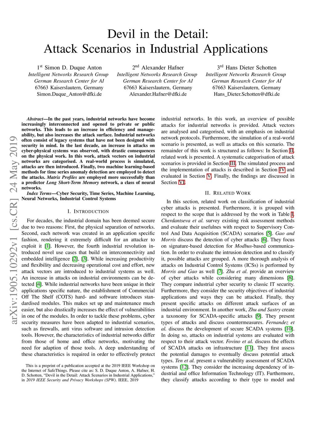 In the past years, industrial networks have become increasingly interconnected and opened to private or public networks. This leads to an increase in efficiency and manageability, but also increases the attack surface. Industrial networks often consist of legacy systems that have not been designed with security in mind. In the last decade, an increase in attacks on cyber-physical systems was observed, with drastic consequences on the physical work. In this work, attack vectors on industrial networks are categorised. A real-world process is simulated, attacks are then introduced. Finally, two machine learning-based methods for time series anomaly detection are employed to detect the attacks. Matrix Profiles are employed more successfully than a predictor Long Short-Term Memory network, a class of neural networks.