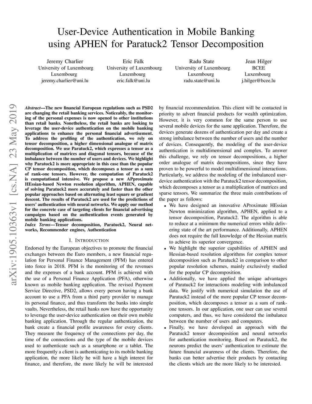 The new financial European regulations such as PSD2 are changing the retail banking services. Noticeably, the monitoring of the personal expenses is now opened to other institutions than retail banks. Nonetheless, the retail banks are looking to leverage the user-device authentication on the mobile banking applications to enhance the personal financial advertisement. To address the profiling of the authentication, we rely on tensor decomposition, a higher dimensional analogue of matrix decomposition. We use Paratuck2, which expresses a tensor as a multiplication of matrices and diagonal tensors, because of the imbalance between the number of users and devices. We highlight why Paratuck2 is more appropriate in this case than the popular CP tensor decomposition, which decomposes a tensor as a sum of rank-one tensors. However, the computation of Paratuck2 is computational intensive. We propose a new APproximate HEssian-based Newton resolution algorithm, APHEN, capable of solving Paratuck2 more accurately and faster than the other popular approaches based on alternating least square or gradient descent. The results of Paratuck2 are used for the predictions of users' authentication with neural networks. We apply our method for the concrete case of targeting clients for financial advertising campaigns based on the authentication events generated by mobile banking applications.