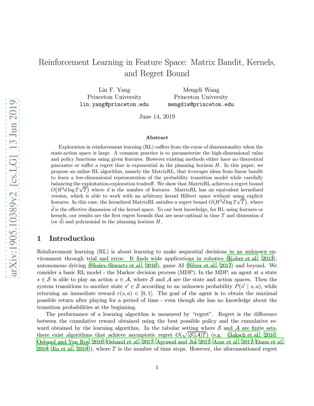 Reinforcement Learning in Feature Space: Matrix Bandit, Kernels, and
