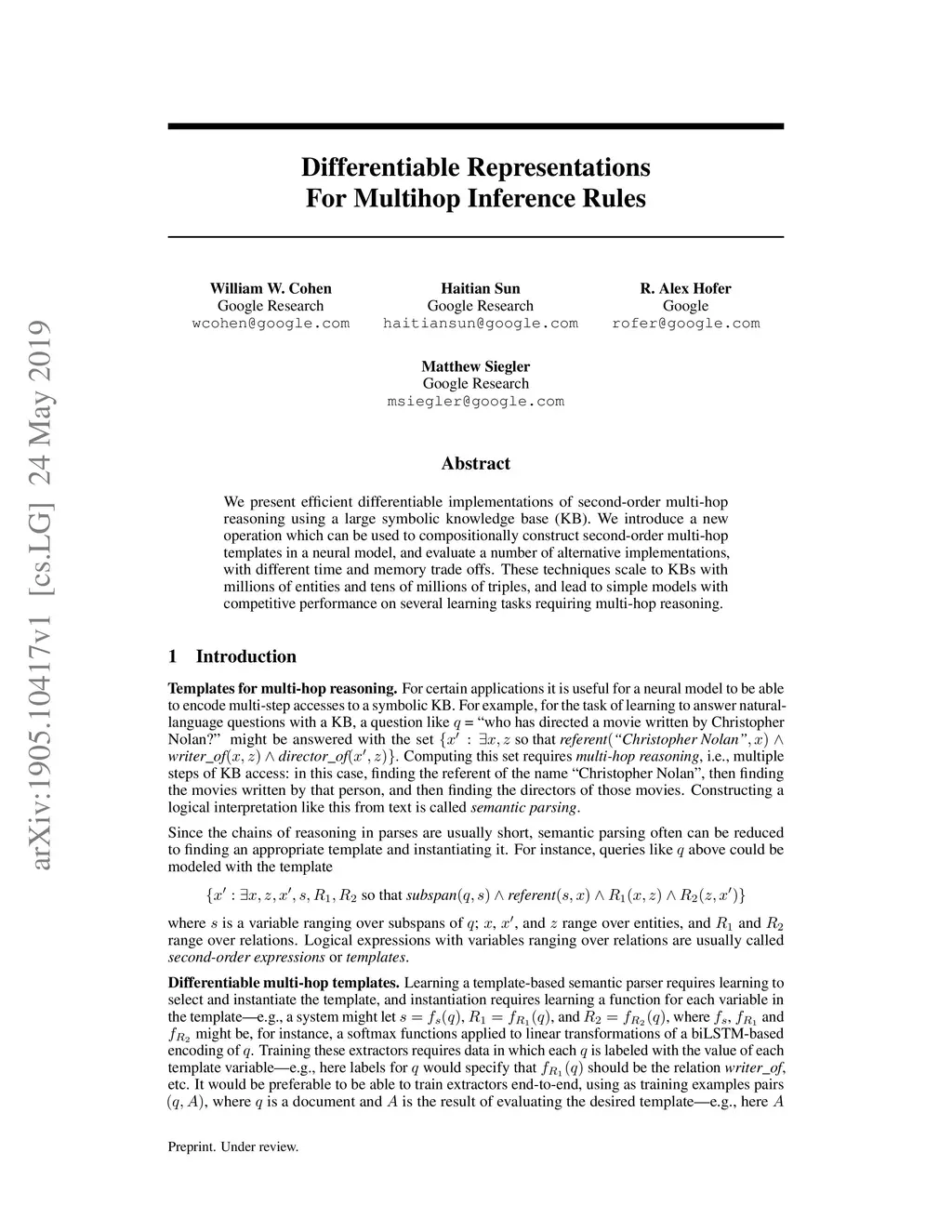 We present efficient differentiable implementations of second-order multi-hop reasoning using a large symbolic knowledge base (KB). We introduce a new operation which can be used to compositionally construct second-order multi-hop templates in a neural model, and evaluate a number of alternative implementations, with different time and memory trade offs. These techniques scale to KBs with millions of entities and tens of millions of triples, and lead to simple models with competitive performance on several learning tasks requiring multi-hop reasoning.