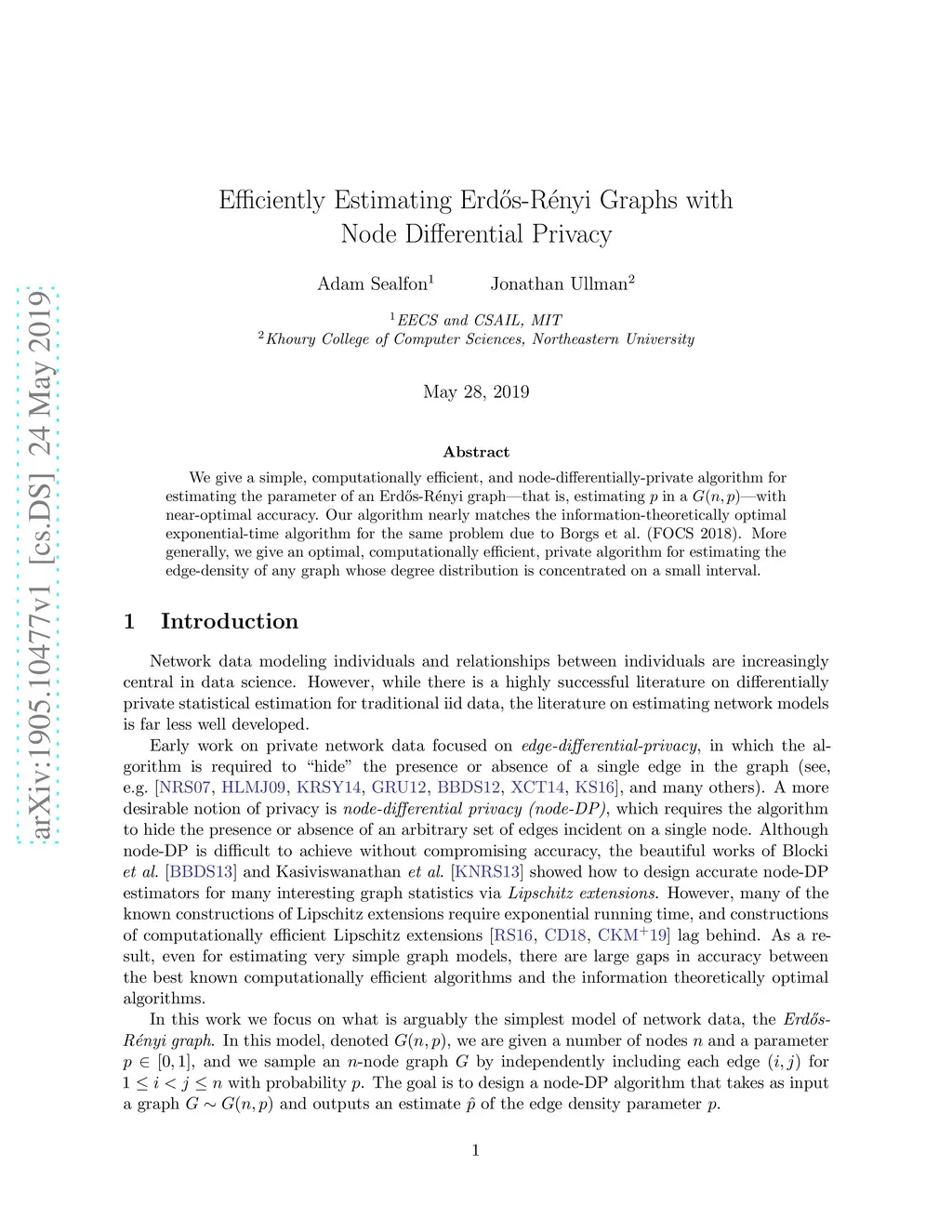 We give a simple, computationally efficient, and node-differentially-private algorithm for estimating the parameter of an Erdos-Renyi graph---that is, estimating p in a G(n,p)---with near-optimal accuracy. Our algorithm nearly matches the information-theoretically optimal exponential-time algorithm for the same problem due to Borgs et al. (FOCS 2018). More generally, we give an optimal, computationally efficient, private algorithm for estimating the edge-density of any graph whose degree distribution is concentrated on a small interval.