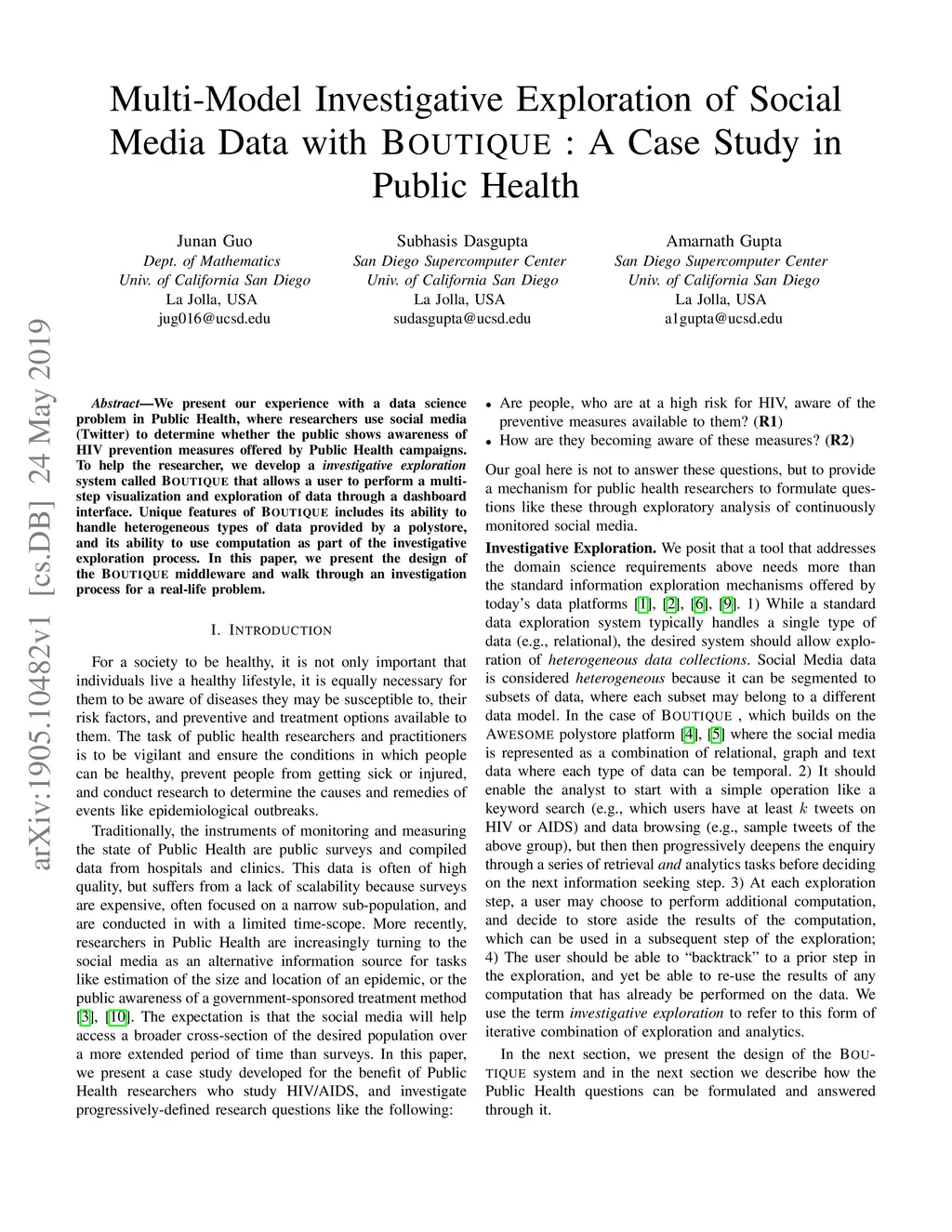 We present our experience with a data science problem in Public Health, where researchers use social media (Twitter) to determine whether the public shows awareness of HIV prevention measures offered by Public Health campaigns. To help the researcher, we develop an investigative exploration system called boutique that allows a user to perform a multi-step visualization and exploration of data through a dashboard interface. Unique features of boutique includes its ability to handle heterogeneous types of data provided by a polystore, and its ability to use computation as part of the investigative exploration process. In this paper, we present the design of the boutique middleware and walk through an investigation process for a real-life problem.