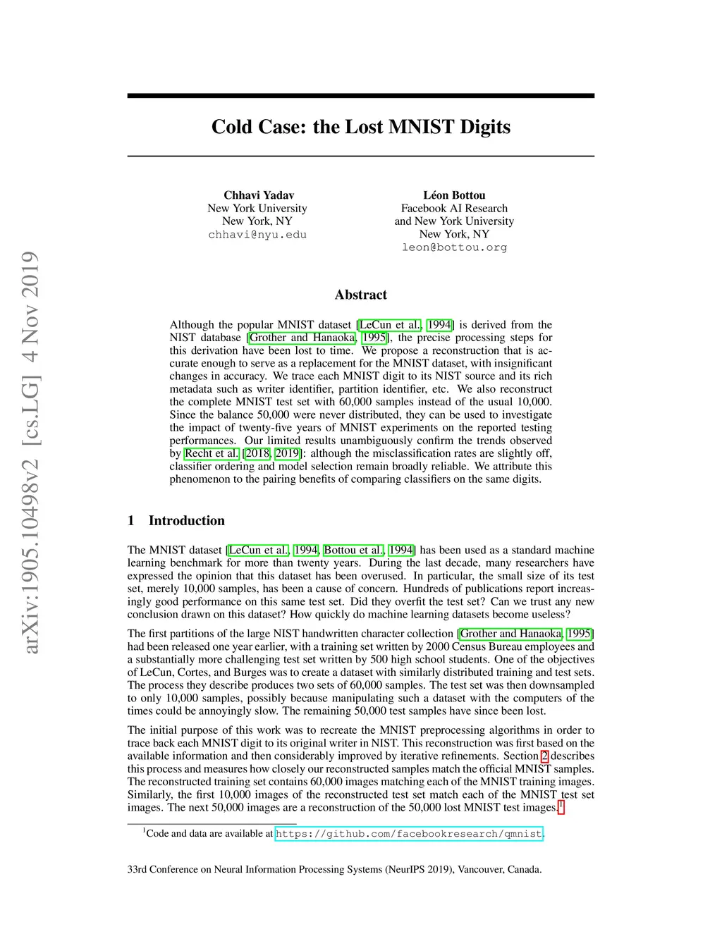 Although the popular MNIST dataset [LeCun et al., 1994] is derived from the NIST database [Grother and Hanaoka, 1995], the precise processing steps for this derivation have been lost to time. We propose a reconstruction that is accurate enough to serve as a replacement for the MNIST dataset, with insignificant changes in accuracy. We trace each MNIST digit to its NIST source and its rich metadata such as writer identifier, partition identifier, etc. We also reconstruct the complete MNIST test set with 60,000 samples instead of the usual 10,000. Since the balance 50,000 were never distributed, they enable us to investigate the impact of twenty-five years of MNIST experiments on the reported testing performances. Our results unambiguously confirm the trends observed by Recht et al. [2018, 2019]: although the misclassification rates are slightly off, classifier ordering and model selection remain broadly reliable. We attribute this phenomenon to the pairing benefits of comparing classifiers on the same digits.