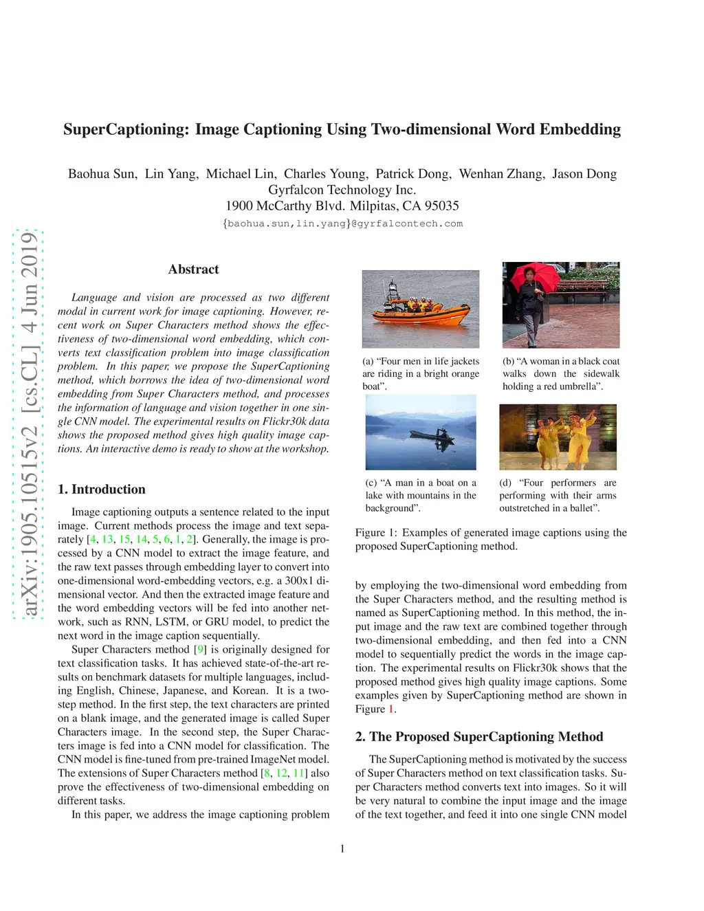Language and vision are processed as two different modal in current work for image captioning. However, recent work on Super Characters method shows the effectiveness of two-dimensional word embedding, which converts text classification problem into image classification problem. In this paper, we propose the SuperCaptioning method, which borrows the idea of two-dimensional word embedding from Super Characters method, and processes the information of language and vision together in one single CNN model. The experimental results on Flickr30k data shows the proposed method gives high quality image captions. An interactive demo is ready to show at the workshop.
