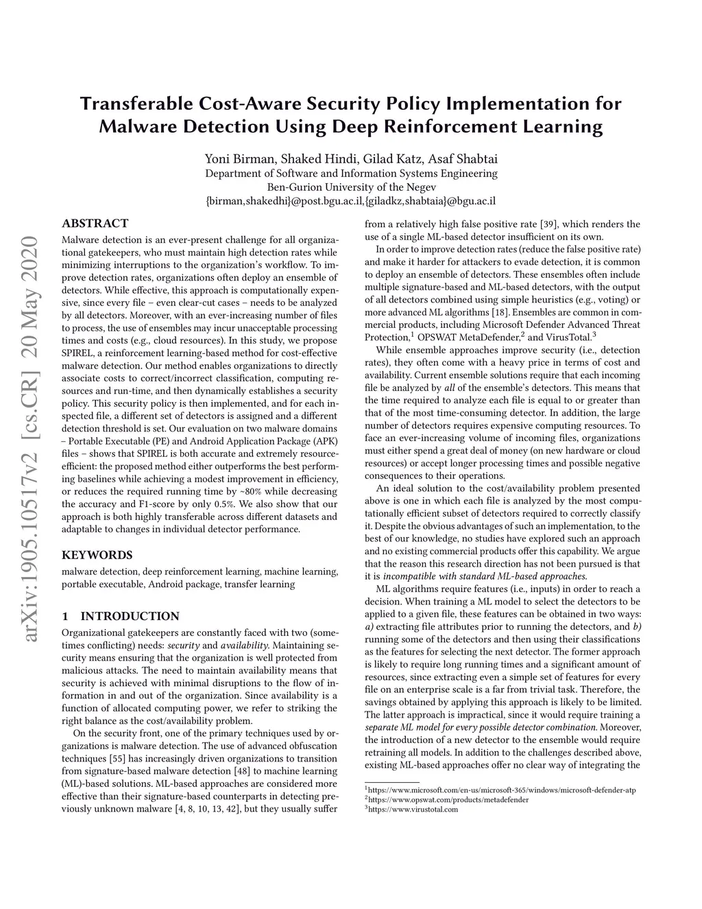 Malware detection is an ever-present challenge for all organizational gatekeepers, who must maintain high detection rates while minimizing interruptions to the organization's workflow. To improve detection rates, organizations often deploy an ensemble of detectors. While effective, this approach is computationally expensive, since every file - even clear-cut cases - needs to be analyzed by all detectors. Moreover, with an ever-increasing number of files to process, the use of ensembles may incur unacceptable processing times and costs (e.g., cloud resources). In this study, we propose SPIREL, a reinforcement learning-based method for cost-effective malware detection. Our method enables organizations to directly associate costs to correct/incorrect classification, computing resources and run-time, and then dynamically establishes a security policy. This security policy is then implemented, and for each inspected file, a different set of detectors is assigned and a different detection threshold is set. Our evaluation on two malware domains- Portable Executable (PE) and Android Application Package (APK)files - shows that SPIREL is both accurate and extremely resource-efficient: the proposed method either outperforms the best performing baselines while achieving a modest improvement in efficiency, or reduces the required running time by ~80% while decreasing the accuracy and F1-score by only 0.5%. We also show that our approach is both highly transferable across different datasets and adaptable to changes in individual detector performance.