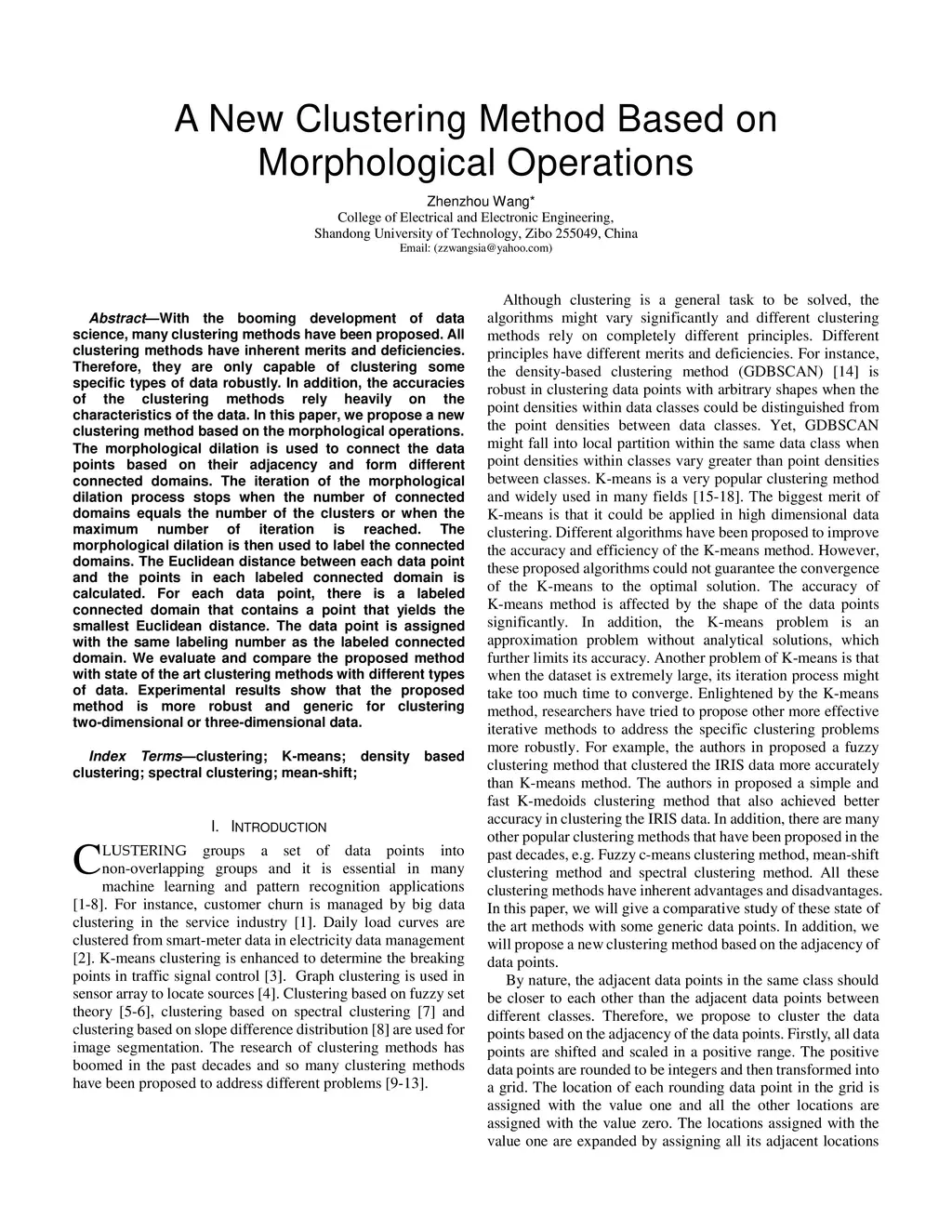 With the booming development of data science, many clustering methods have been proposed. All clustering methods have inherent merits and deficiencies. Therefore, they are only capable of clustering some specific types of data robustly. In addition, the accuracies of the clustering methods rely heavily on the characteristics of the data. In this paper, we propose a new clustering method based on the morphological operations. The morphological dilation is used to connect the data points based on their adjacency and form different connected domains. The iteration of the morphological dilation process stops when the number of connected domains equals the number of the clusters or when the maximum number of iteration is reached. The morphological dilation is then used to label the connected domains. The Euclidean distance between each data point and the points in each labeled connected domain is calculated. For each data point, there is a labeled connected domain that contains a point that yields the smallest Euclidean distance. The data point is assigned with the same labeling number as the labeled connected domain. We evaluate and compare the proposed method with state of the art clustering methods with different types of data. Experimental results show that the proposed method is more robust and generic for clustering two-dimensional or three-dimensional data.