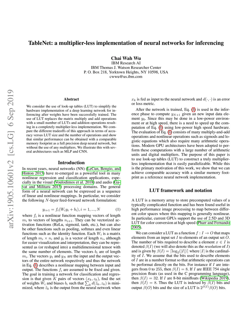 We consider the use of look-up tables (LUT) to simplify the hardware implementation of a deep learning network for inferencing after weights have been successfully trained. The use of LUT replaces the matrix multiply and add operations with a small number of LUTs and addition operations resulting in a completely multiplier-less implementation. We compare the different tradeoffs of this approach in terms of accuracy versus LUT size and the number of operations and show that similar performance can be obtained with a comparable memory footprint as a full precision deep neural network, but without the use of any multipliers. We illustrate this with several architectures such as MLP and CNN.