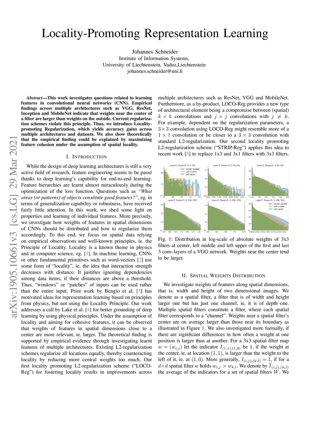 This work investigates fundamental questions related to learning features in convolutional neural networks (CNN). Empirical findings across multiple architectures such as VGG, ResNet, Inception, DenseNet and MobileNet indicate that weights near the center of a filter are larger than weights on the outside. Current regularization schemes violate this principle. Thus, we introduce Locality-promoting Regularization (LOCO-Reg), which yields accuracy gains across multiple architectures and datasets. We also show theoretically that the empirical finding is a consequence of maximizing feature cohesion under the assumption of spatial locality.