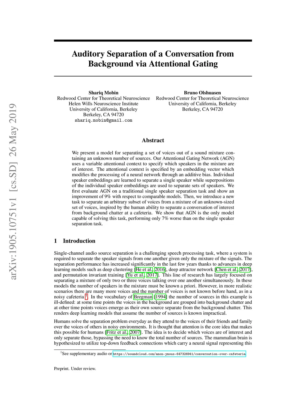 Auditory Separation of a Conversation from Background via Attentional