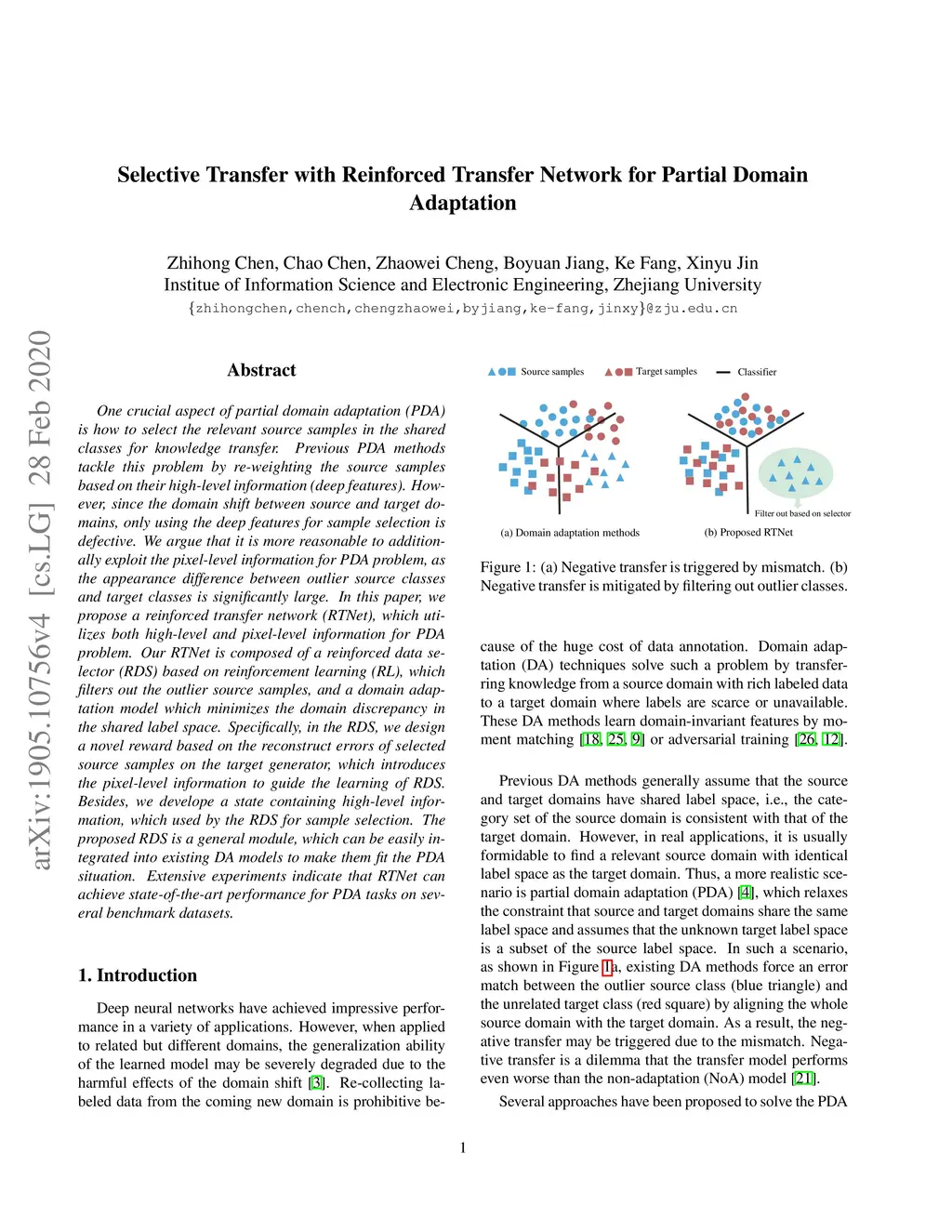 One crucial aspect of partial domain adaptation (PDA) is how to select the relevant source samples in the shared classes for knowledge transfer. Previous PDA methods tackle this problem by re-weighting the source samples based on their high-level information (deep features). However, since the domain shift between source and target domains, only using the deep features for sample selection is defective. We argue that it is more reasonable to additionally exploit the pixel-level information for PDA problem, as the appearance difference between outlier source classes and target classes is significantly large. In this paper, we propose a reinforced transfer network (RTNet), which utilizes both high-level and pixel-level information for PDA problem. Our RTNet is composed of a reinforced data selector (RDS) based on reinforcement learning (RL), which filters out the outlier source samples, and a domain adaptation model which minimizes the domain discrepancy in the shared label space. Specifically, in the RDS, we design a novel reward based on the reconstruct errors of selected source samples on the target generator, which introduces the pixel-level information to guide the learning of RDS. Besides, we develope a state containing high-level information, which used by the RDS for sample selection. The proposed RDS is a general module, which can be easily integrated into existing DA models to make them fit the PDA situation. Extensive experiments indicate that RTNet can achieve state-of-the-art performance for PDA tasks on several benchmark datasets.