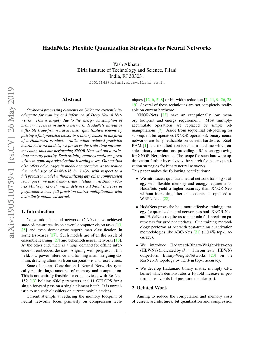 On-board processing elements on UAVs are currently inadequate for training and inference of Deep Neural Networks. This is largely due to the energy consumption of memory accesses in such a network. HadaNets introduce a flexible train-from-scratch tensor quantization scheme by pairing a full precision tensor to a binary tensor in the form of a Hadamard product. Unlike wider reduced precision neural network models, we preserve the train-time parameter count, thus out-performing XNOR-Nets without a train-time memory penalty. Such training routines could see great utility in semi-supervised online learning tasks. Our method also offers advantages in model compression, as we reduce the model size of ResNet-18 by 7.43 times with respect to a full precision model without utilizing any other compression techniques. We also demonstrate a 'Hadamard Binary Matrix Multiply' kernel, which delivers a 10-fold increase in performance over full precision matrix multiplication with a similarly optimized kernel.
