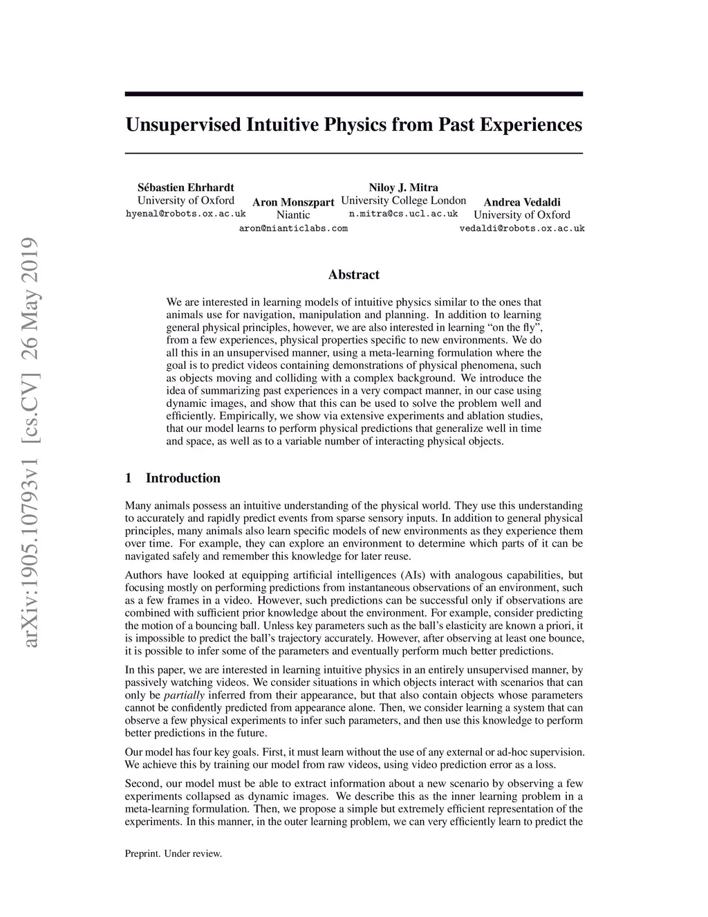Unsupervised Intuitive Physics from Past Experiences
