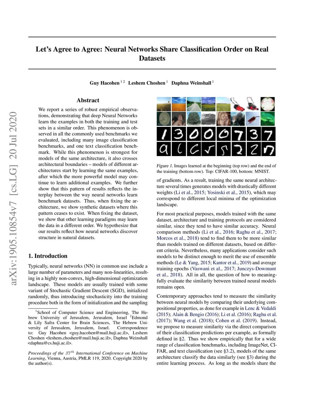 We report a series of robust empirical observations, demonstrating that deep Neural Networks learn the examples in both the training and test sets in a similar order. This phenomenon is observed in all the commonly used benchmarks we evaluated, including many image classification benchmarks, and one text classification benchmark. While this phenomenon is strongest for models of the same architecture, it also crosses architectural boundaries -- models of different architectures start by learning the same examples, after which the more powerful model may continue to learn additional examples. We further show that this pattern of results reflects the interplay between the way neural networks learn benchmark datasets. Thus, when fixing the architecture, we show synthetic datasets where this pattern ceases to exist. When fixing the dataset, we show that other learning paradigms may learn the data in a different order. We hypothesize that our results reflect how neural networks discover structure in natural datasets.
