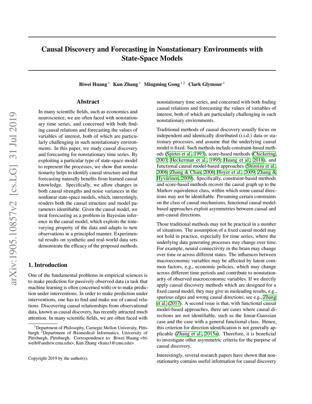 In many scientific fields, such as economics and neuroscience, we are often faced with nonstationary time series, and concerned with both finding causal relations and forecasting the values of variables of interest, both of which are particularly challenging in such nonstationary environments. In this paper, we study causal discovery and forecasting for nonstationary time series. By exploiting a particular type of state-space model to represent the processes, we show that nonstationarity helps to identify causal structure and that forecasting naturally benefits from learned causal knowledge. Specifically, we allow changes in both causal strengths and noise variances in the nonlinear state-space models, which, interestingly, renders both the causal structure and model parameters identifiable. Given the causal model, we treat forecasting as a problem in Bayesian inference in the causal model, which exploits the time-varying property of the data and adapts to new observations in a principled manner. Experimental results on synthetic and real-world data sets demonstrate the efficacy of the proposed methods.