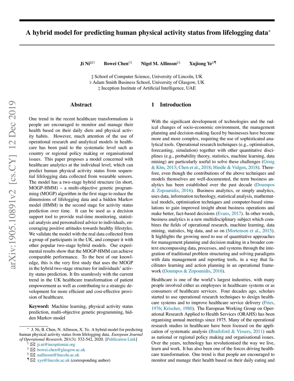One trend in the recent healthcare transformations is people are encouraged to monitor and manage their health based on their daily diets and physical activity habits. However, much attention of the use of operational research and analytical models in healthcare has been paid to the systematic level such as country or regional policy making or organisational issues. This paper proposes a model concerned with healthcare analytics at the individual level, which can predict human physical activity status from sequential lifelogging data collected from wearable sensors. The model has a two-stage hybrid structure (in short, MOGP-HMM) -- a multi-objective genetic programming (MOGP) algorithm in the first stage to reduce the dimensions of lifelogging data and a hidden Markov model (HMM) in the second stage for activity status prediction over time. It can be used as a decision support tool to provide real-time monitoring, statistical analysis and personalized advice to individuals, encouraging positive attitudes towards healthy lifestyles. We validate the model with the real data collected from a group of participants in the UK, and compare it with other popular two-stage hybrid models. Our experimental results show that the MOGP-HMM can achieve comparable performance. To the best of our knowledge, this is the very first study that uses the MOGP in the hybrid two-stage structure for individuals' activity status prediction. It fits seamlessly with the current trend in the UK healthcare transformation of patient empowerment as well as contributing to a strategic development for more efficient and cost-effective provision of healthcare.