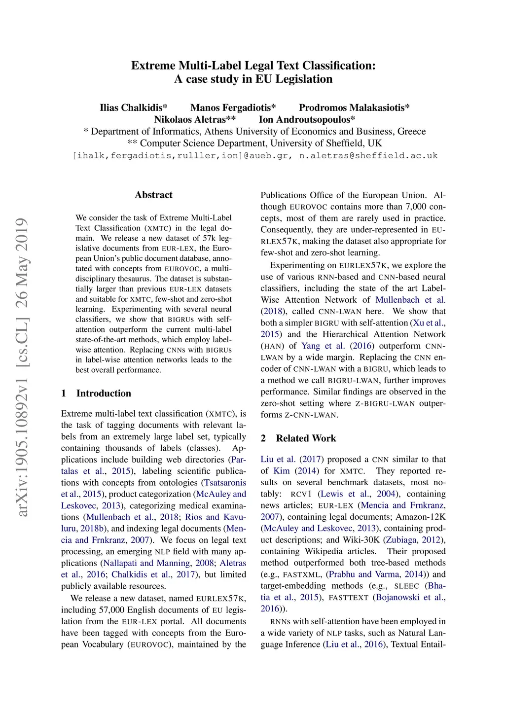 We consider the task of Extreme Multi-Label Text Classification (XMTC) in the legal domain. We release a new dataset of 57k legislative documents from EURLEX, the European Union's public document database, annotated with concepts from EUROVOC, a multidisciplinary thesaurus. The dataset is substantially larger than previous EURLEX datasets and suitable for XMTC, few-shot and zero-shot learning. Experimenting with several neural classifiers, we show that BIGRUs with self-attention outperform the current multi-label state-of-the-art methods, which employ label-wise attention. Replacing CNNs with BIGRUs in label-wise attention networks leads to the best overall performance.