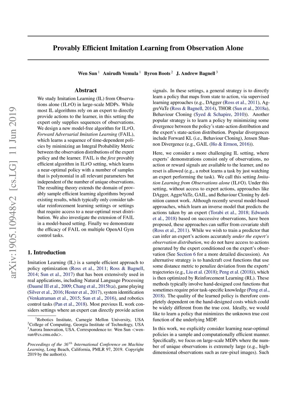 We study Imitation Learning (IL) from Observations alone (ILFO) in large-scale MDPs. While most IL algorithms rely on an expert to directly provide actions to the learner, in this setting the expert only supplies sequences of observations. We design a new model-free algorithm for ILFO, Forward Adversarial Imitation Learning (FAIL), which learns a sequence of time-dependent policies by minimizing an Integral Probability Metric between the observation distributions of the expert policy and the learner. FAIL is the first provably efficient algorithm in ILFO setting, which learns a near-optimal policy with a number of samples that is polynomial in all relevant parameters but independent of the number of unique observations. The resulting theory extends the domain of provably sample efficient learning algorithms beyond existing results, which typically only consider tabular reinforcement learning settings or settings that require access to a near-optimal reset distribution. We also investigate the extension of FAIL in a model-based setting. Finally we demonstrate the efficacy of FAIL on multiple OpenAI Gym control tasks.