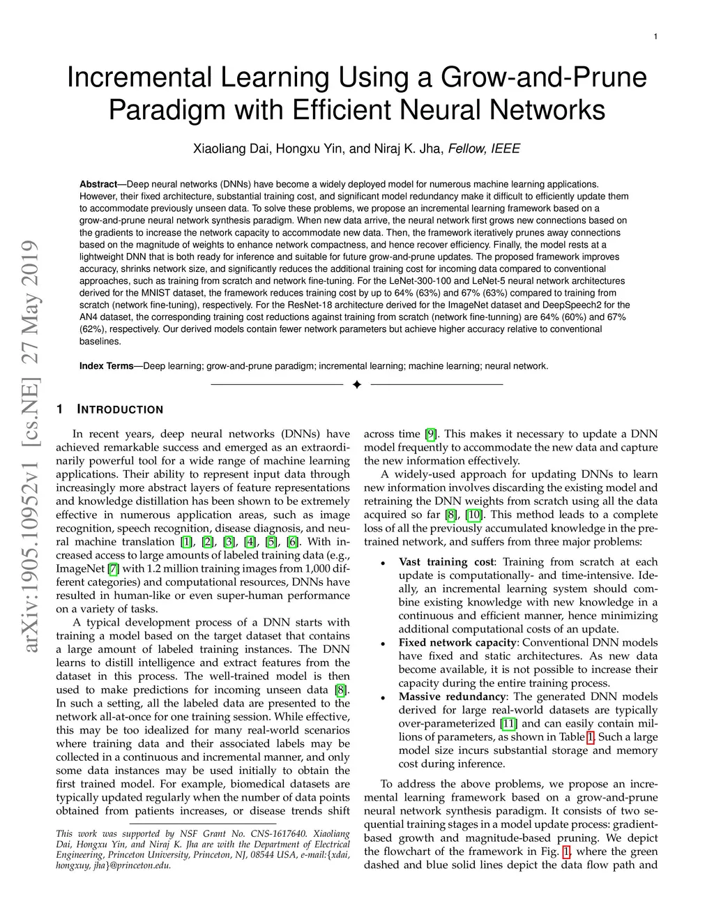Incremental Learning Using a Grow-and-Prune Paradigm with Efficient