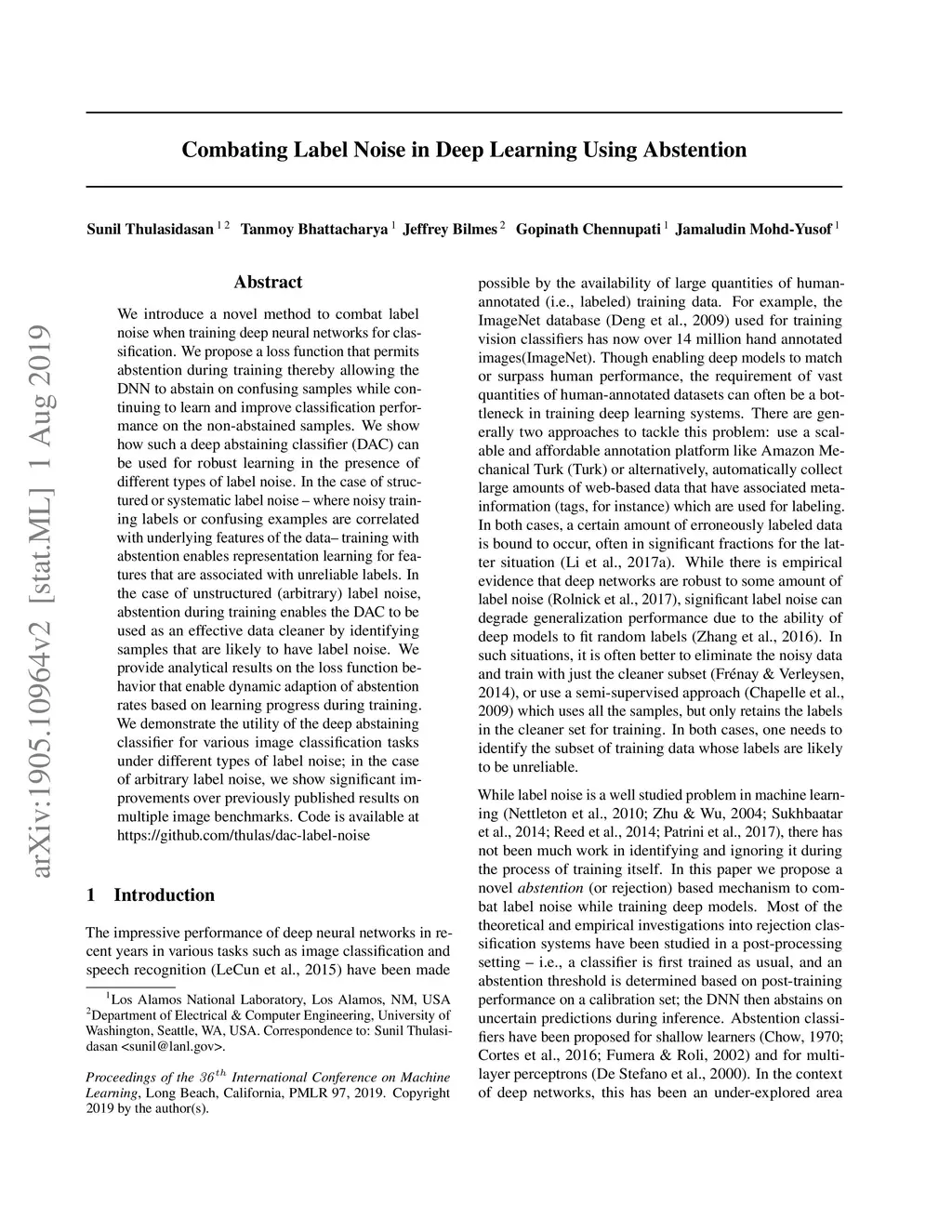 We introduce a novel method to combat label noise when training deep neural networks for classification. We propose a loss function that permits abstention during training thereby allowing the DNN to abstain on confusing samples while continuing to learn and improve classification performance on the non-abstained samples. We show how such a deep abstaining classifier (DAC) can be used for robust learning in the presence of different types of label noise. In the case of structured or systematic label noise -- where noisy training labels or confusing examples are correlated with underlying features of the data-- training with abstention enables representation learning for features that are associated with unreliable labels. In the case of unstructured (arbitrary) label noise, abstention during training enables the DAC to be used as an effective data cleaner by identifying samples that are likely to have label noise. We provide analytical results on the loss function behavior that enable dynamic adaption of abstention rates based on learning progress during training. We demonstrate the utility of the deep abstaining classifier for various image classification tasks under different types of label noise; in the case of arbitrary label noise, we show significant improvements over previously published results on multiple image benchmarks. Source code is available at https://github.com/thulas/dac-label-noise