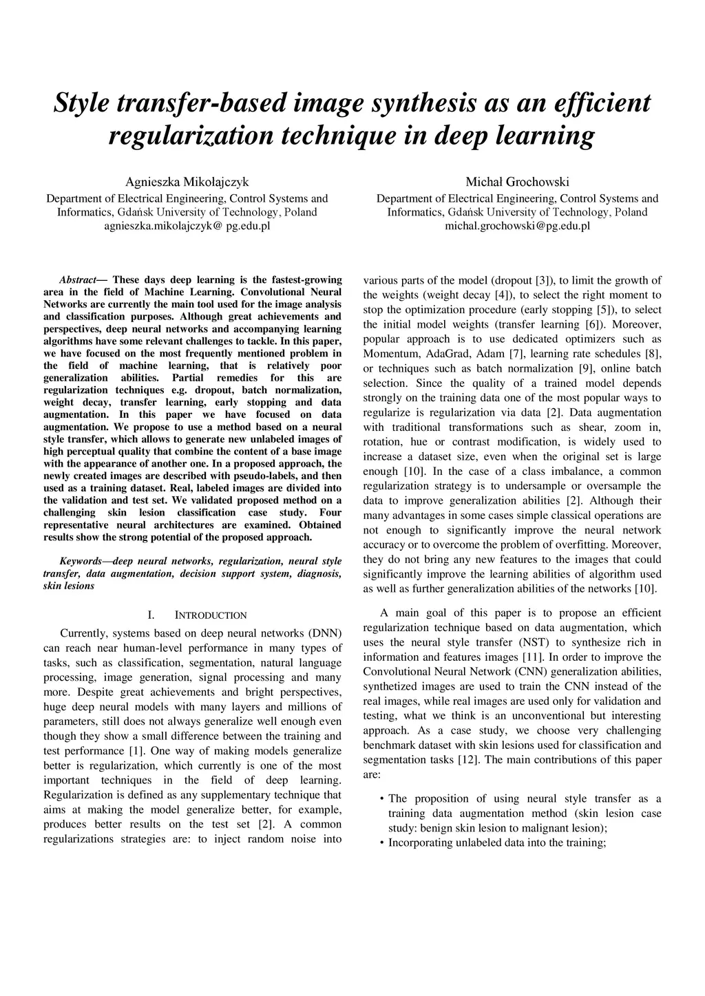 These days deep learning is the fastest-growing area in the field of Machine Learning. Convolutional Neural Networks are currently the main tool used for image analysis and classification purposes. Although great achievements and perspectives, deep neural networks and accompanying learning algorithms have some relevant challenges to tackle. In this paper, we have focused on the most frequently mentioned problem in the field of machine learning, that is relatively poor generalization abilities. Partial remedies for this are regularization techniques e.g. dropout, batch normalization, weight decay, transfer learning, early stopping and data augmentation. In this paper, we have focused on data augmentation. We propose to use a method based on a neural style transfer, which allows generating new unlabeled images of a high perceptual quality that combine the content of a base image with the appearance of another one. In a proposed approach, the newly created images are described with pseudo-labels, and then used as a training dataset. Real, labeled images are divided into the validation and test set. We validated the proposed method on a challenging skin lesion classification case study. Four representative neural architectures are examined. Obtained results show the strong potential of the proposed approach.
