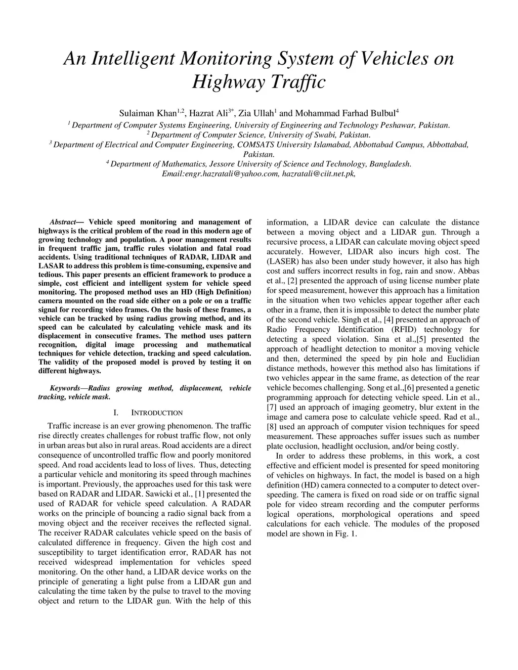 Vehicle speed monitoring and management of highways is the critical problem of the road in this modern age of growing technology and population. A poor management results in frequent traffic jam, traffic rules violation and fatal road accidents. Using traditional techniques of RADAR, LIDAR and LASAR to address this problem is time-consuming, expensive and tedious. This paper presents an efficient framework to produce a simple, cost efficient and intelligent system for vehicle speed monitoring. The proposed method uses an HD (High Definition) camera mounted on the road side either on a pole or on a traffic signal for recording video frames. On the basis of these frames, a vehicle can be tracked by using radius growing method, and its speed can be calculated by calculating vehicle mask and its displacement in consecutive frames. The method uses pattern recognition, digital image processing and mathematical techniques for vehicle detection, tracking and speed calculation. The validity of the proposed model is proved by testing it on different highways.