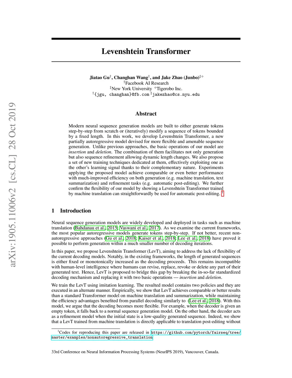 Modern neural sequence generation models are built to either generate tokens step-by-step from scratch or (iteratively) modify a sequence of tokens bounded by a fixed length. In this work, we develop Levenshtein Transformer, a new partially autoregressive model devised for more flexible and amenable sequence generation. Unlike previous approaches, the atomic operations of our model are insertion and deletion. The combination of them facilitates not only generation but also sequence refinement allowing dynamic length changes. We also propose a set of new training techniques dedicated at them, effectively exploiting one as the other's learning signal thanks to their complementary nature. Experiments applying the proposed model achieve comparable performance but much-improved efficiency on both generation (e.g. machine translation, text summarization) and refinement tasks (e.g. automatic post-editing). We further confirm the flexibility of our model by showing a Levenshtein Transformer trained by machine translation can straightforwardly be used for automatic post-editing.