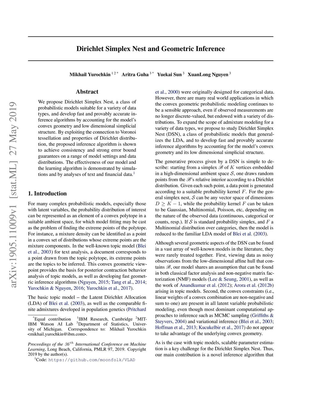 We propose Dirichlet Simplex Nest, a class of probabilistic models suitable for a variety of data types, and develop fast and provably accurate inference algorithms by accounting for the model's convex geometry and low dimensional simplicial structure. By exploiting the connection to Voronoi tessellation and properties of Dirichlet distribution, the proposed inference algorithm is shown to achieve consistency and strong error bound guarantees on a range of model settings and data distributions. The effectiveness of our model and the learning algorithm is demonstrated by simulations and by analyses of text and financial data.