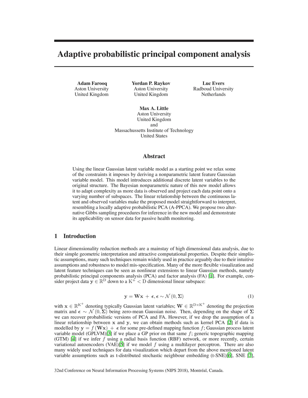 Using the linear Gaussian latent variable model as a starting point we relax some of the constraints it imposes by deriving a nonparametric latent feature Gaussian variable model. This model introduces additional discrete latent variables to the original structure. The Bayesian nonparametric nature of this new model allows it to adapt complexity as more data is observed and project each data point onto a varying number of subspaces. The linear relationship between the continuous latent and observed variables make the proposed model straightforward to interpret, resembling a locally adaptive probabilistic PCA (A-PPCA). We propose two alternative Gibbs sampling procedures for inference in the new model and demonstrate its applicability on sensor data for passive health monitoring.