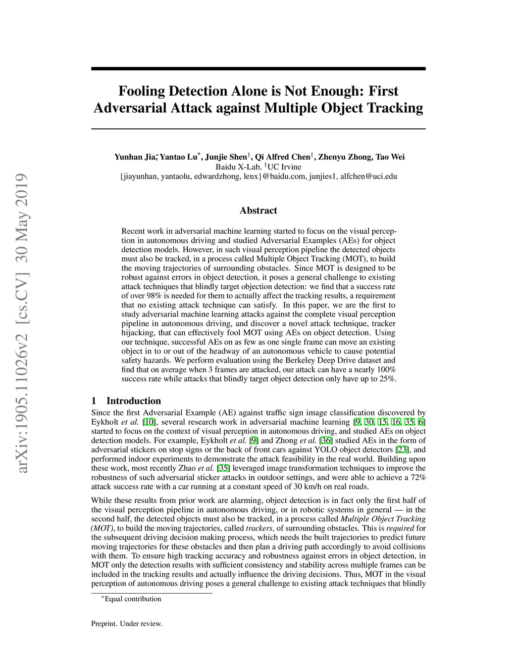 Recent work in adversarial machine learning started to focus on the visual perception in autonomous driving and studied Adversarial Examples (AEs) for object detection models. However, in such visual perception pipeline the detected objects must also be tracked, in a process called Multiple Object Tracking (MOT), to build the moving trajectories of surrounding obstacles. Since MOT is designed to be robust against errors in object detection, it poses a general challenge to existing attack techniques that blindly target objection detection: we find that a success rate of over 98% is needed for them to actually affect the tracking results, a requirement that no existing attack technique can satisfy. In this paper, we are the first to study adversarial machine learning attacks against the complete visual perception pipeline in autonomous driving, and discover a novel attack technique, tracker hijacking, that can effectively fool MOT using AEs on object detection. Using our technique, successful AEs on as few as one single frame can move an existing object in to or out of the headway of an autonomous vehicle to cause potential safety hazards. We perform evaluation using the Berkeley Deep Drive dataset and find that on average when 3 frames are attacked, our attack can have a nearly 100% success rate while attacks that blindly target object detection only have up to 25%.