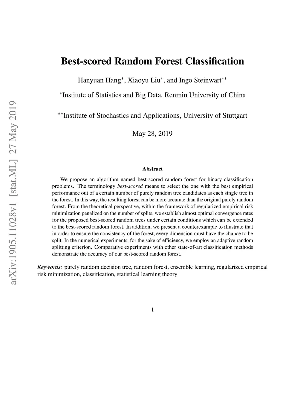 We propose an algorithm named best-scored random forest for binary classification problems. The terminology "best-scored" means to select the one with the best empirical performance out of a certain number of purely random tree candidates as each single tree in the forest. In this way, the resulting forest can be more accurate than the original purely random forest. From the theoretical perspective, within the framework of regularized empirical risk minimization penalized on the number of splits, we establish almost optimal convergence rates for the proposed best-scored random trees under certain conditions which can be extended to the best-scored random forest. In addition, we present a counterexample to illustrate that in order to ensure the consistency of the forest, every dimension must have the chance to be split. In the numerical experiments, for the sake of efficiency, we employ an adaptive random splitting criterion. Comparative experiments with other state-of-art classification methods demonstrate the accuracy of our best-scored random forest.