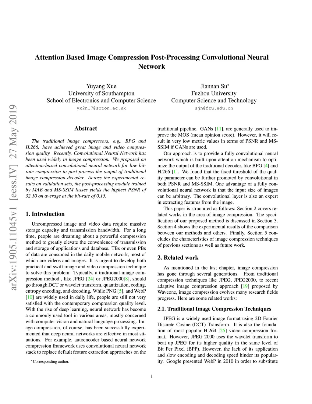The traditional image compressors, e.g., BPG and H.266, have achieved great image and video compression quality. Recently, Convolutional Neural Network has been used widely in image compression. We proposed an attention-based convolutional neural network for low bit-rate compression to post-process the output of traditional image compression decoder. Across the experimental results on validation sets, the post-processing module trained by MAE and MS-SSIM losses yields the highest PSNR of 32.10 on average at the bit-rate of 0.15.