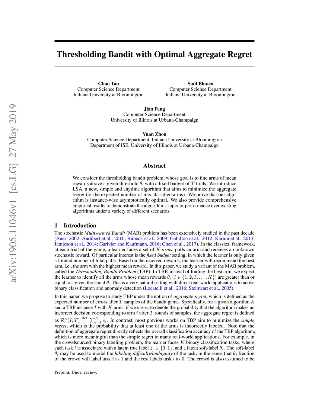 We consider the thresholding bandit problem, whose goal is to find arms of mean rewards above a given threshold , with a fixed budget of trials. We introduce LSA, a new, simple and anytime algorithm that aims to minimize the aggregate regret (or the expected number of mis-classified arms). We prove that our algorithm is instance-wise asymptotically optimal. We also provide comprehensive empirical results to demonstrate the algorithm's superior performance over existing algorithms under a variety of different scenarios.