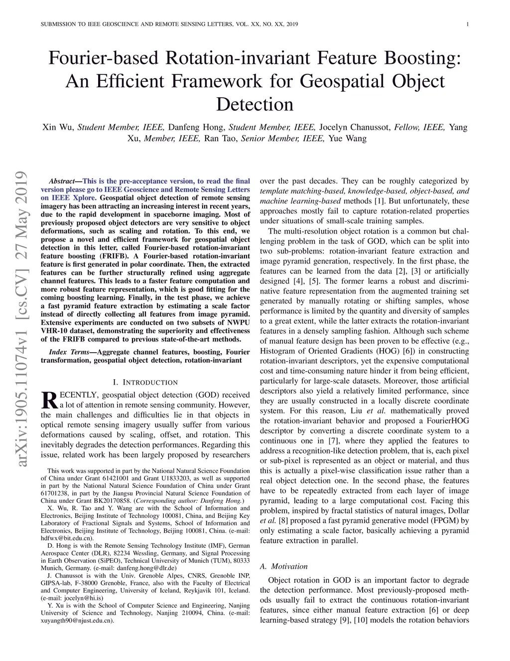 Geospatial object detection of remote sensing imagery has been attracting an increasing interest in recent years, due to the rapid development in spaceborne imaging. Most of previously proposed object detectors are very sensitive to object deformations, such as scaling and rotation. To this end, we propose a novel and efficient framework for geospatial object detection in this letter, called Fourier-based rotation-invariant feature boosting (FRIFB). A Fourier-based rotation-invariant feature is first generated in polar coordinate. Then, the extracted features can be further structurally refined using aggregate channel features. This leads to a faster feature computation and more robust feature representation, which is good fitting for the coming boosting learning. Finally, in the test phase, we achieve a fast pyramid feature extraction by estimating a scale factor instead of directly collecting all features from image pyramid. Extensive experiments are conducted on two subsets of NWPU VHR-10 dataset, demonstrating the superiority and effectiveness of the FRIFB compared to previous state-of-the-art methods.