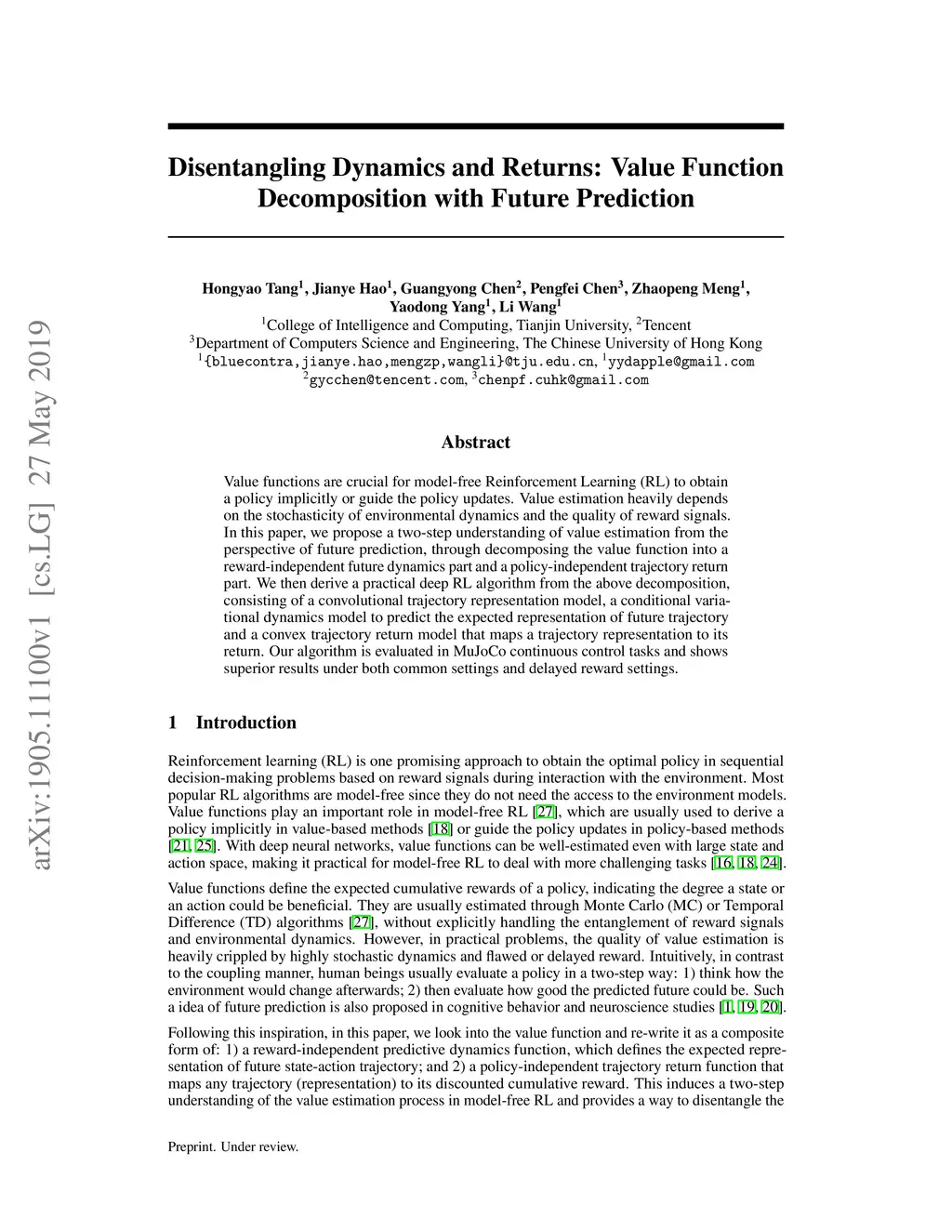 Value functions are crucial for model-free Reinforcement Learning (RL) to obtain a policy implicitly or guide the policy updates. Value estimation heavily depends on the stochasticity of environmental dynamics and the quality of reward signals. In this paper, we propose a two-step understanding of value estimation from the perspective of future prediction, through decomposing the value function into a reward-independent future dynamics part and a policy-independent trajectory return part. We then derive a practical deep RL algorithm from the above decomposition, consisting of a convolutional trajectory representation model, a conditional variational dynamics model to predict the expected representation of future trajectory and a convex trajectory return model that maps a trajectory representation to its return. Our algorithm is evaluated in MuJoCo continuous control tasks and shows superior results under both common settings and delayed reward settings.