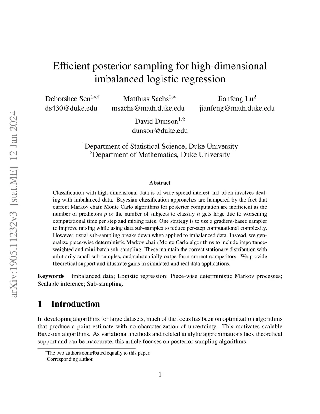High-dimensional data are routinely collected in many areas. We are particularly interested in Bayesian classification models in which one or more variables are imbalanced. Current Markov chain Monte Carlo algorithms for posterior computation are inefficient as and/or increase due to worsening time per step and mixing rates. One strategy is to use a gradient-based sampler to improve mixing while using data sub-samples to reduce per-step computational complexity. However, usual sub-sampling breaks down when applied to imbalanced data. Instead, we generalize piece-wise deterministic Markov chain Monte Carlo algorithms to include importance-weighted and mini-batch sub-sampling. These approaches maintain the correct stationary distribution with arbitrarily small sub-samples, and substantially outperform current competitors. We provide theoretical support and illustrate gains in simulated and real data applications.
