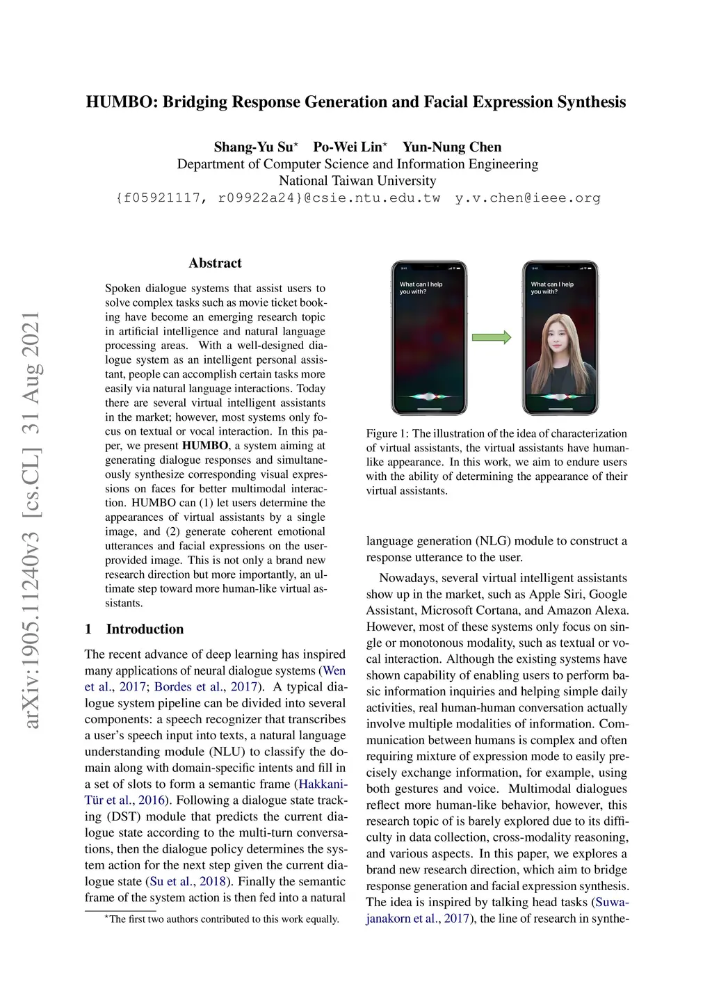 Spoken dialogue systems that assist users to solve complex tasks such as movie ticket booking have become an emerging research topic in artificial intelligence and natural language processing areas. With a well-designed dialogue system as an intelligent personal assistant, people can accomplish certain tasks more easily via natural language interactions. Today there are several virtual intelligent assistants in the market; however, most systems only focus on textual or vocal interaction. In this paper, we present HUMBO, a system aiming at generating dialogue responses and simultaneously synthesize corresponding visual expressions on faces for better multimodal interaction. HUMBO can (1) let users determine the appearances of virtual assistants by a single image, and (2) generate coherent emotional utterances and facial expressions on the user-provided image. This is not only a brand new research direction but more importantly, an ultimate step toward more human-like virtual assistants.