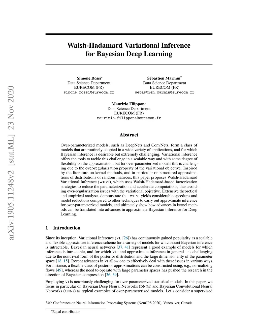 Over-parameterized models, such as DeepNets and ConvNets, form a class of models that are routinely adopted in a wide variety of applications, and for which Bayesian inference is desirable but extremely challenging. Variational inference offers the tools to tackle this challenge in a scalable way and with some degree of flexibility on the approximation, but for over-parameterized models this is challenging due to the over-regularization property of the variational objective. Inspired by the literature on kernel methods, and in particular on structured approximations of distributions of random matrices, this paper proposes Walsh-Hadamard Variational Inference (WHVI), which uses Walsh-Hadamard-based factorization strategies to reduce the parameterization and accelerate computations, thus avoiding over-regularization issues with the variational objective. Extensive theoretical and empirical analyses demonstrate that WHVI yields considerable speedups and model reductions compared to other techniques to carry out approximate inference for over-parameterized models, and ultimately show how advances in kernel methods can be translated into advances in approximate Bayesian inference.