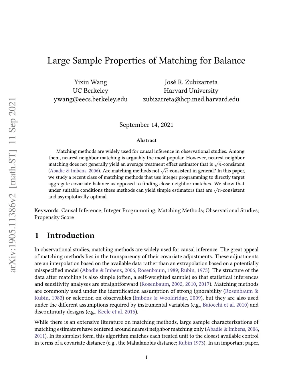 Matching methods are widely used for causal inference in observational studies. Among them, nearest neighbor matching is arguably the most popular. However, nearest neighbor matching does not generally yield an average treatment effect estimator that is -consistent (Abadie and Imbens, 2006). Are matching methods not -consistent in general? In this paper, we study a recent class of matching methods that use integer programming to directly target aggregate covariate balance as opposed to finding close neighbor matches. We show that under suitable conditions these methods can yield simple estimators that are -consistent and asymptotically optimal.