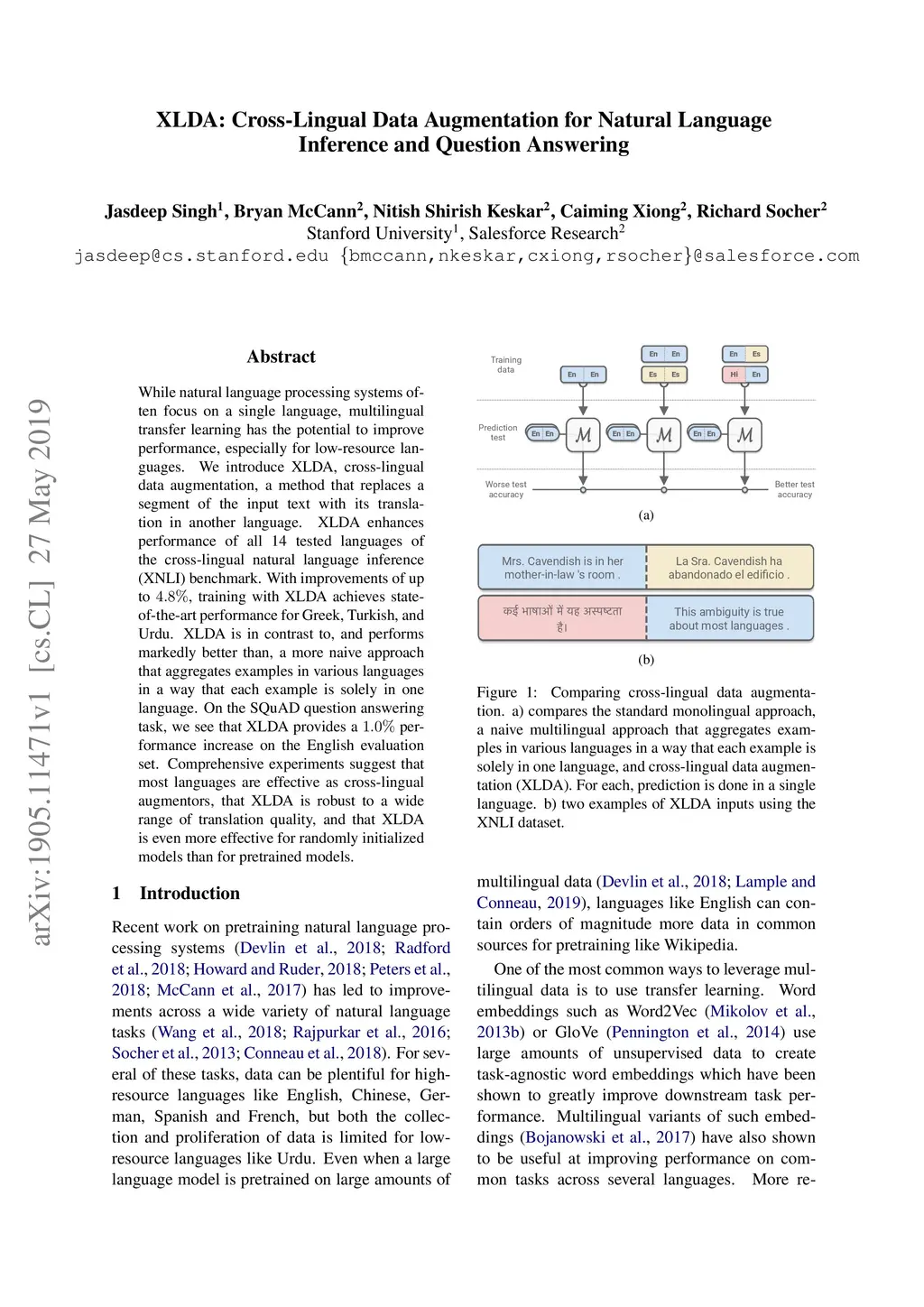 While natural language processing systems often focus on a single language, multilingual transfer learning has the potential to improve performance, especially for low-resource languages. We introduce XLDA, cross-lingual data augmentation, a method that replaces a segment of the input text with its translation in another language. XLDA enhances performance of all 14 tested languages of the cross-lingual natural language inference (XNLI) benchmark. With improvements of up to , training with XLDA achieves state-of-the-art performance for Greek, Turkish, and Urdu. XLDA is in contrast to, and performs markedly better than, a more naive approach that aggregates examples in various languages in a way that each example is solely in one language. On the SQuAD question answering task, we see that XLDA provides a performance increase on the English evaluation set. Comprehensive experiments suggest that most languages are effective as cross-lingual augmentors, that XLDA is robust to a wide range of translation quality, and that XLDA is even more effective for randomly initialized models than for pretrained models.