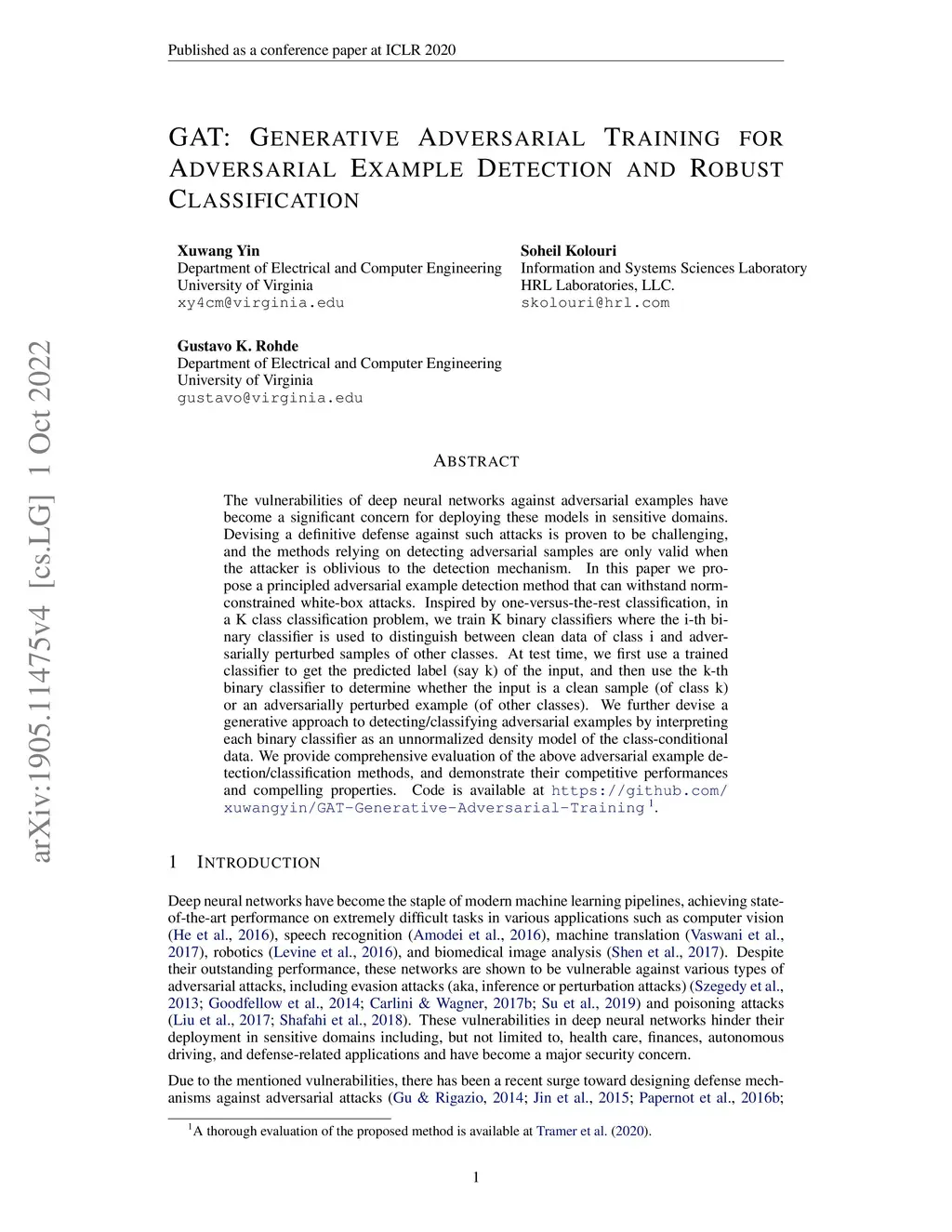 GAT: Generative Adversarial Training for Adversarial Example Detection