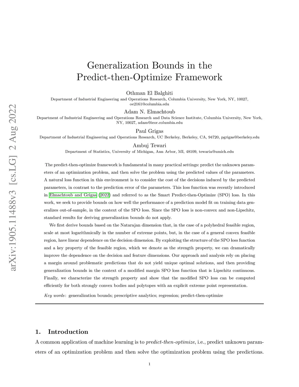 The predict-then-optimize framework is fundamental in many practical settings: predict the unknown parameters of an optimization problem, and then solve the problem using the predicted values of the parameters. A natural loss function in this environment is to consider the cost of the decisions induced by the predicted parameters, in contrast to the prediction error of the parameters. This loss function was recently introduced in Elmachtoub and Grigas (2017) and referred to as the Smart Predict-then-Optimize (SPO) loss. In this work, we seek to provide bounds on how well the performance of a prediction model fit on training data generalizes out-of-sample, in the context of the SPO loss. Since the SPO loss is non-convex and non-Lipschitz, standard results for deriving generalization bounds do not apply. We first derive bounds based on the Natarajan dimension that, in the case of a polyhedral feasible region, scale at most logarithmically in the number of extreme points, but, in the case of a general convex feasible region, have linear dependence on the decision dimension. By exploiting the structure of the SPO loss function and a key property of the feasible region, which we denote as the strength property, we can dramatically improve the dependence on the decision and feature dimensions. Our approach and analysis rely on placing a margin around problematic predictions that do not yield unique optimal solutions, and then providing generalization bounds in the context of a modified margin SPO loss function that is Lipschitz continuous. Finally, we characterize the strength property and show that the modified SPO loss can be computed efficiently for both strongly convex bodies and polytopes with an explicit extreme point representation.