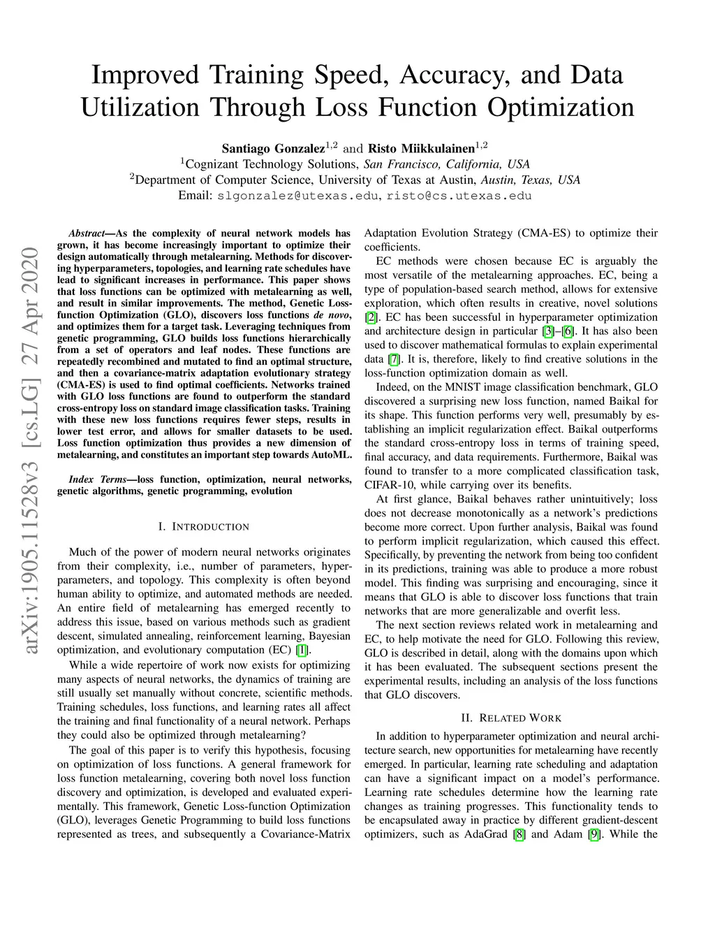 As the complexity of neural network models has grown, it has become increasingly important to optimize their design automatically through metalearning. Methods for discovering hyperparameters, topologies, and learning rate schedules have lead to significant increases in performance. This paper shows that loss functions can be optimized with metalearning as well, and result in similar improvements. The method, Genetic Loss-function Optimization (GLO), discovers loss functions de novo, and optimizes them for a target task. Leveraging techniques from genetic programming, GLO builds loss functions hierarchically from a set of operators and leaf nodes. These functions are repeatedly recombined and mutated to find an optimal structure, and then a covariance-matrix adaptation evolutionary strategy (CMA-ES) is used to find optimal coefficients. Networks trained with GLO loss functions are found to outperform the standard cross-entropy loss on standard image classification tasks. Training with these new loss functions requires fewer steps, results in lower test error, and allows for smaller datasets to be used. Loss-function optimization thus provides a new dimension of metalearning, and constitutes an important step towards AutoML.