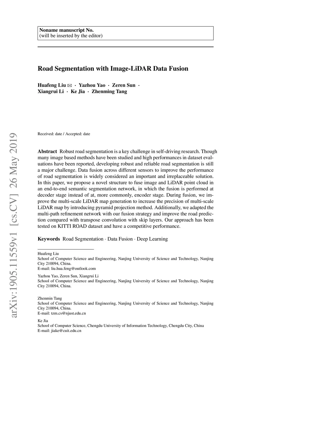 Road Segmentation with Image-LiDAR Data Fusion