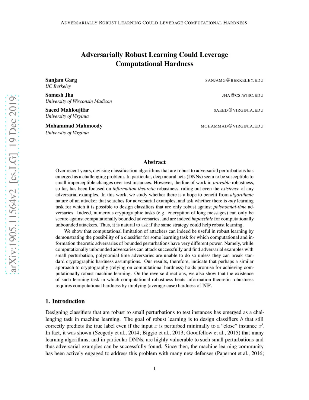 Over recent years, devising classification algorithms that are robust to adversarial perturbations has emerged as a challenging problem. In particular, deep neural nets (DNNs) seem to be susceptible to small imperceptible changes over test instances. However, the line of work in provable robustness, so far, has been focused on information-theoretic robustness, ruling out even the existence of any adversarial examples. In this work, we study whether there is a hope to benefit from algorithmic nature of an attacker that searches for adversarial examples, and ask whether there is any learning task for which it is possible to design classifiers that are only robust against polynomial-time adversaries. Indeed, numerous cryptographic tasks can only be secure against computationally bounded adversaries, and are indeed impossible for computationally unbounded attackers. Thus, it is natural to ask if the same strategy could help robust learning. We show that computational limitation of attackers can indeed be useful in robust learning by demonstrating the possibility of a classifier for some learning task for which computational and information theoretic adversaries of bounded perturbations have very different power. Namely, while computationally unbounded adversaries can attack successfully and find adversarial examples with small perturbation, polynomial time adversaries are unable to do so unless they can break standard cryptographic hardness assumptions. Our results, therefore, indicate that perhaps a similar approach to cryptography (relying on computational hardness) holds promise for achieving computationally robust machine learning. On the reverse directions, we also show that the existence of such learning task in which computational robustness beats information theoretic robustness requires computational hardness by implying (average-case) hardness of NP.