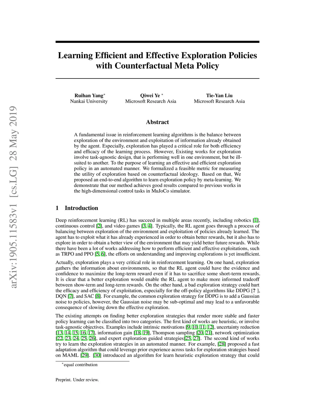 A fundamental issue in reinforcement learning algorithms is the balance between exploration of the environment and exploitation of information already obtained by the agent. Especially, exploration has played a critical role for both efficiency and efficacy of the learning process. However, Existing works for exploration involve task-agnostic design, that is performing well in one environment, but be ill-suited to another. To the purpose of learning an effective and efficient exploration policy in an automated manner. We formalized a feasible metric for measuring the utility of exploration based on counterfactual ideology. Based on that, We proposed an end-to-end algorithm to learn exploration policy by meta-learning. We demonstrate that our method achieves good results compared to previous works in the high-dimensional control tasks in MuJoCo simulator.
